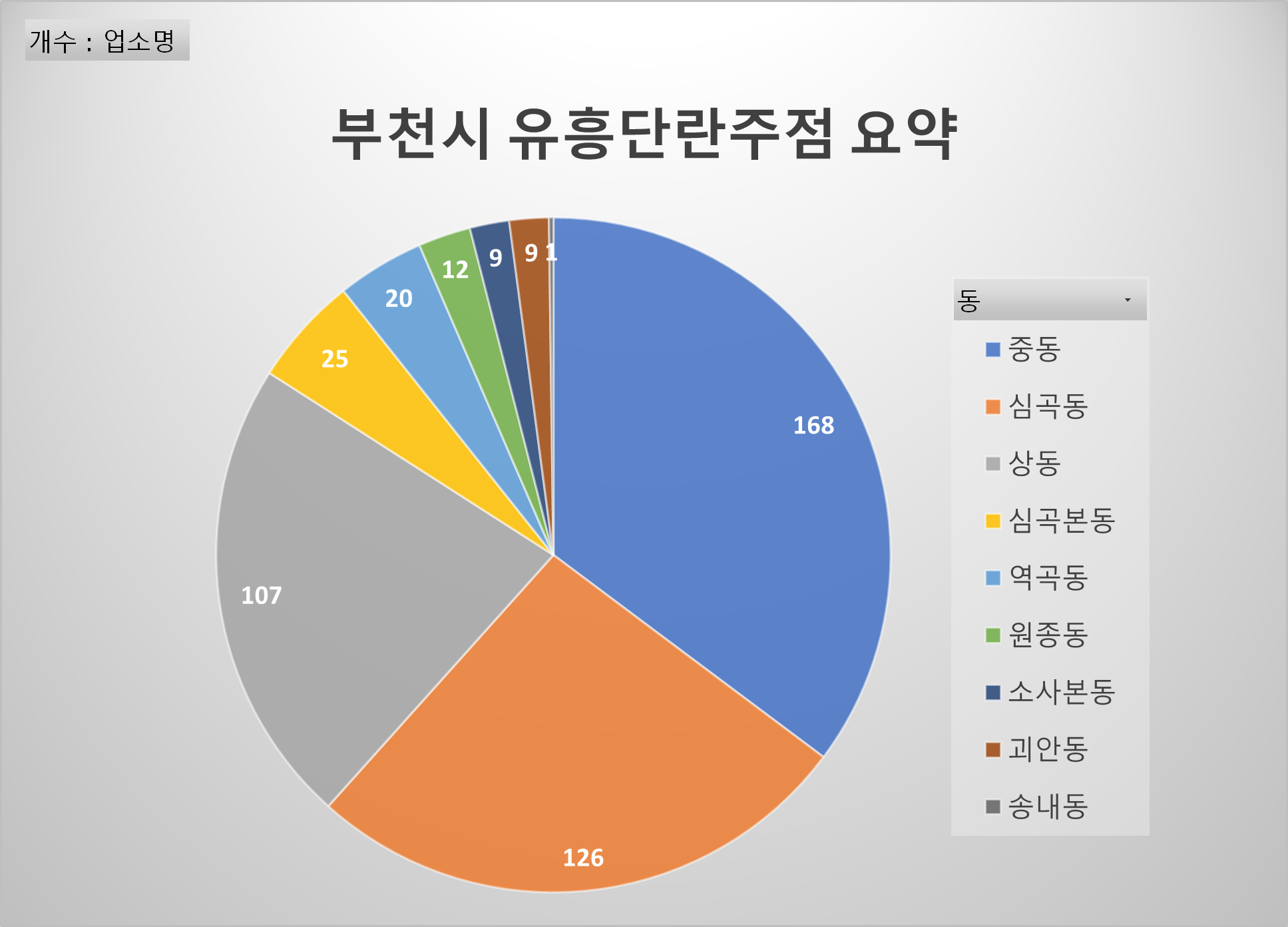 부천시 관내의 유흥단란주점 현황으로 업종명, 업소명, 소재지(지번,도로명), 소재지전화번호 등의 정보를 제공합니다.