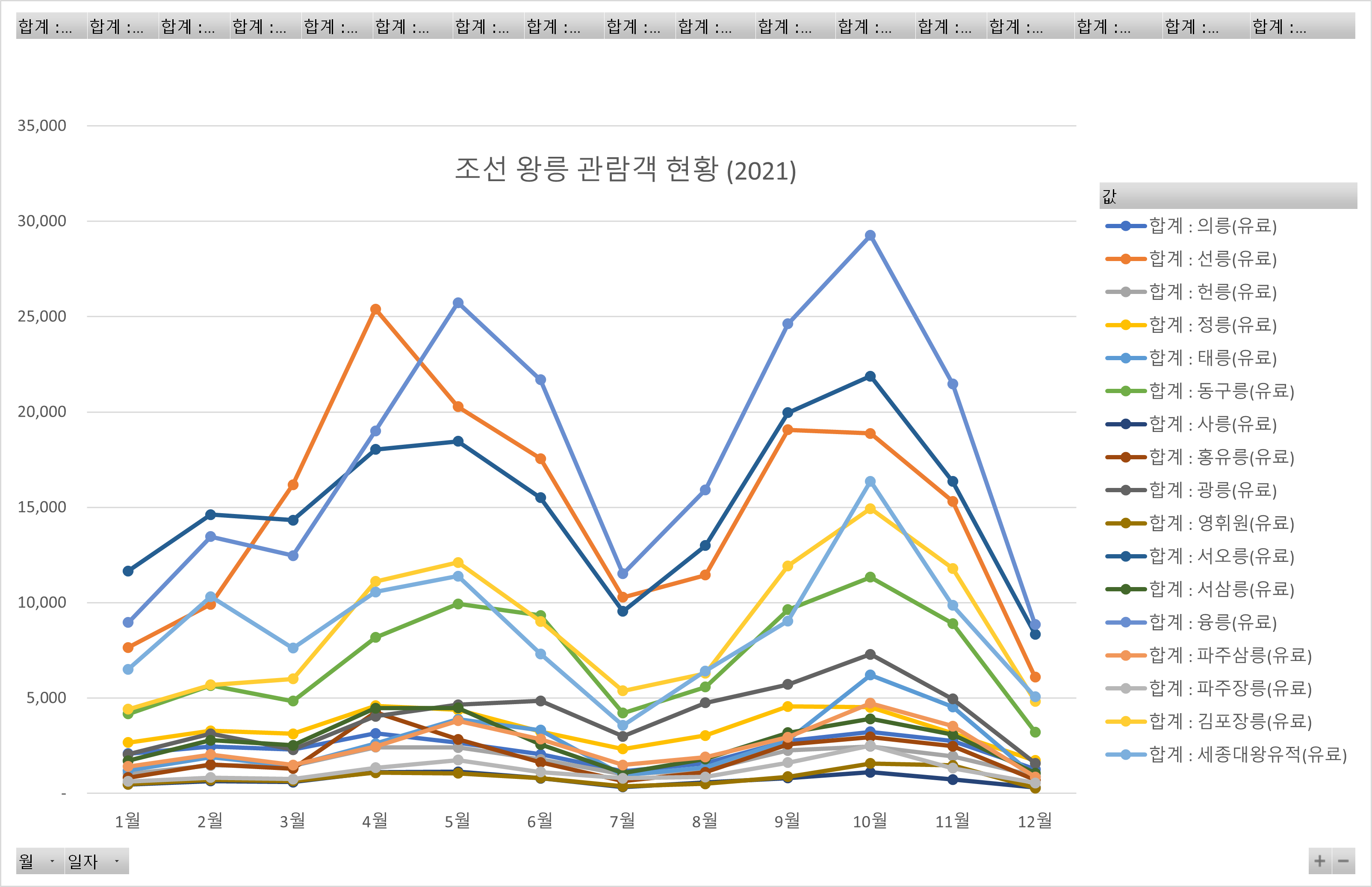 | 행 레이블 | 합계 : 의릉(유료) | 합계 : 선릉(유료) | 합계 : 헌릉(유료) | 합계 : 정릉(유료) | 합계 : 태릉(유료) | 합계 : 동구릉(유료) | 합계 : 사릉(유료) | 합계 : 홍유릉(유료) | 합계 : 광릉(유료) | 합계 : 영휘원(유료) | 합계 : 서오릉(유료) | 합계 : 서삼릉(유료) | 합계 : 융릉(유료) | 합계 : 파주삼릉(유료) | 합계 : 파주장릉(유료) | 합계 : 김포장릉(유료) | 합계 : 세종대왕유적(유료) |