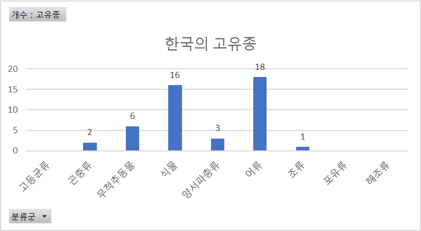- 이 중에 어류가 가장 많은 18종이며, 식물 - 무척추동물 - 양서/파충류 - 곤충 - 조류 순으로 나타났다.