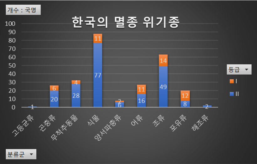- 한국의 멸종 위기종은 식물이 88종으로 가장 많았으며, 조류 - 무척추동물 - 어류 - 곤충류 - 포유류 - 양서/파충류 - 해조류 - 고등균류 순으로 나타났다.