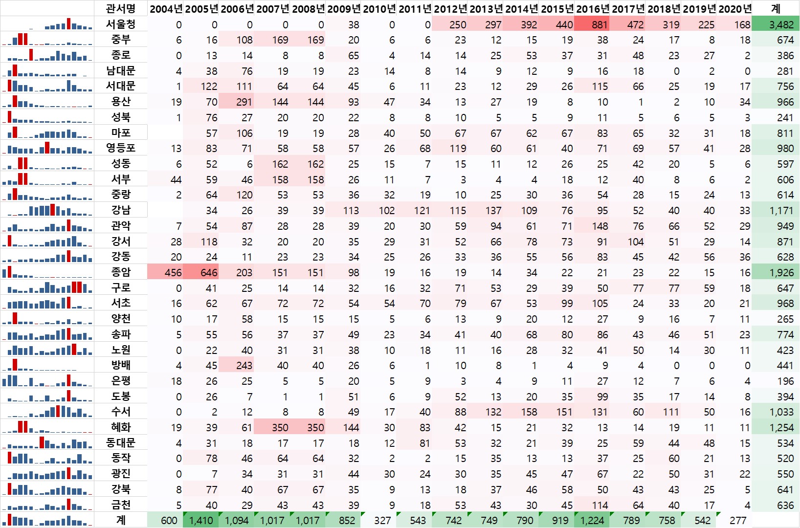 - 관서별로 보았을 때, 서울청이 3,482건으로 가장 많았으며, 종암 - 혜화 - 강남 - 수서 순으로 나타났다.